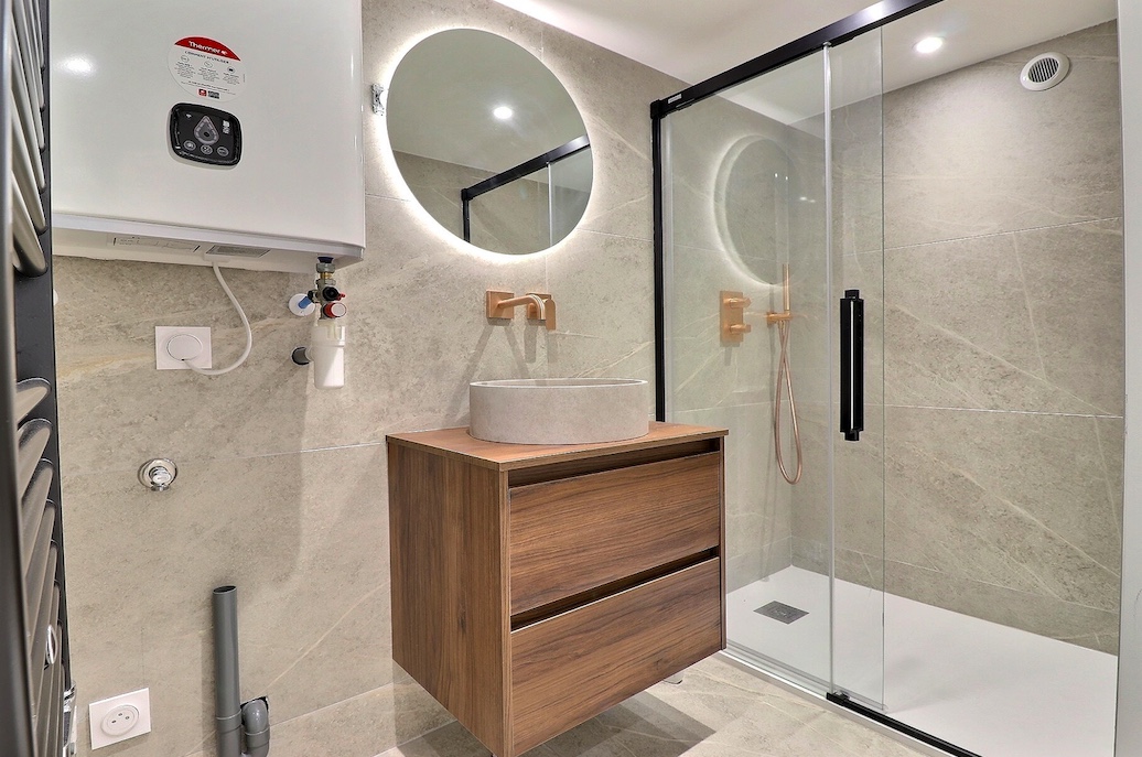 La salle de bains est moderne et fonctionnelle. Elle comprend :