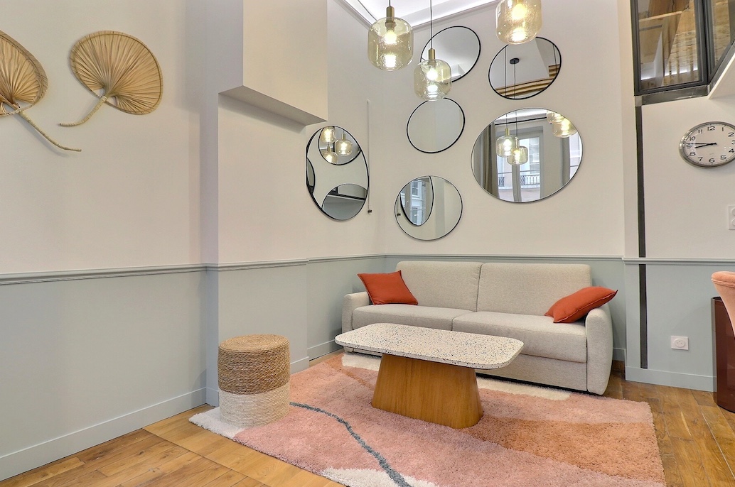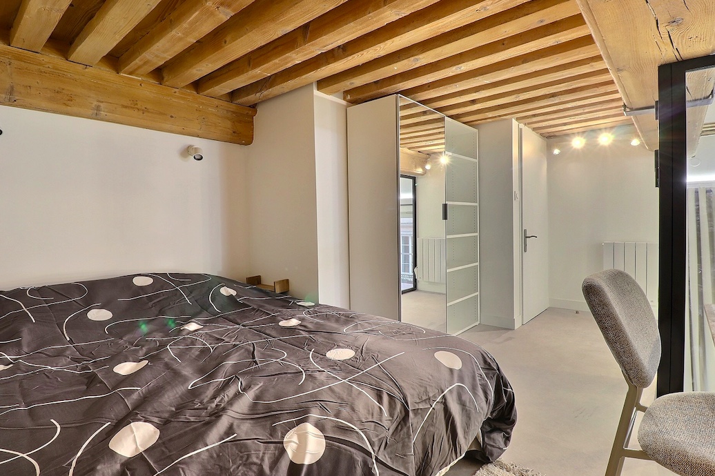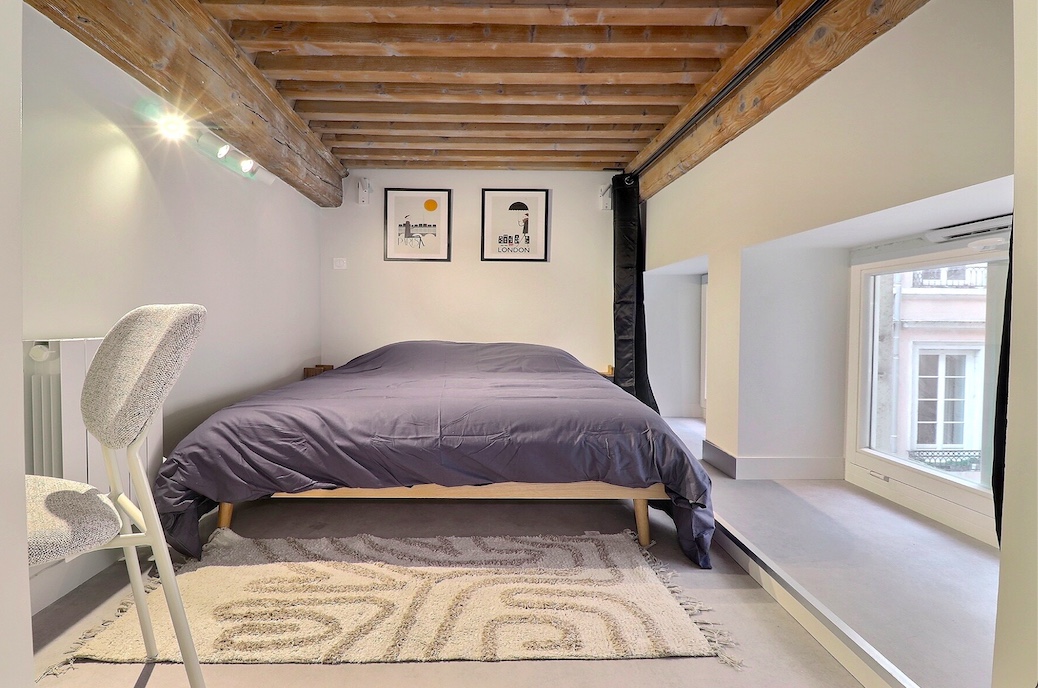 Cet appartement T2 bis meublé à louer à Lyon 1 dispose de deux chambres en mezzanine, optimisant parfaitement l’espace.